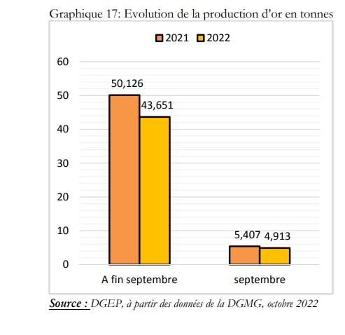 Pour le seul mois de septembre 2022, la production industrielle d’or s’élève à 4,913 tonnes, en hausse de 14,5% par rapport à aout 2022 mais en baisse de 9,1% par rapport à septembre 2021.