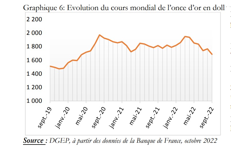 Le budget de l’Etat devrait ressentir le cout de cette baisse puisqu’en septembre 2022, le cours de l’or a connu une baisse de 4,5% par rapport à août 2022, en s’affichant à 1 685,4 dollars US. Sur l’année, la baisse se situe à de 7,1%. D’une manière générale, l’once d’or enregistre un cours moyen de 1 729,9 dollars US au troisième trimestre 2022, en baisse de 7,7% par rapport au trimestre précédent et de 4,0% par rapport au même trimestre un an plus tôt. Le niveau du cours de l’or demeure élevé en lien avec les incertitudes qui pèsent sur l’économie mondiale, rassure la #DGEP.